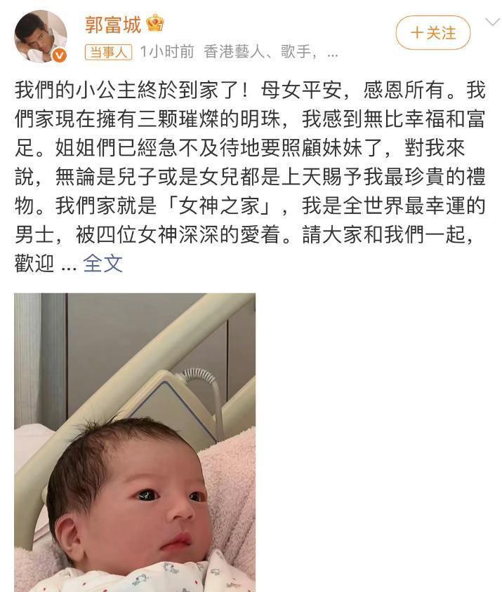 方媛三胎产女!郭富城开心发文,晒宝宝正脸照,称是男是女他都爱